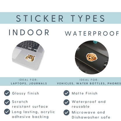 Collez votre meilleur ami n'importe où avec ces autocollants au design moderne et de haute qualité. Nos autocollants pour chiens sont disponibles en deux types différents, des autocollants intérieurs et extérieurs (imperméables), afin que vous puissiez vraiment emmener votre animal de compagnie partout où vous le souhaitez, comme dans votre voiture, etc. Nos autocollants imperméables peuvent affronter les éléments et conviennent aussi bien à l'intérieur qu'à l'extérieur. utiliser. Cet autocollant pour animaux de compagnie conçu avec goût peut être acheté pour votre maison, ou un cadeau idéal pour les amoureux des chiens ou des chats, des cadeaux commémoratifs pour animaux de compagnie, des souvenirs commémoratifs pour animaux de compagnie, des cadeaux pour les propriétaires de chiens, des cadeaux personnalisés pour animaux de compagnie et plus encore !