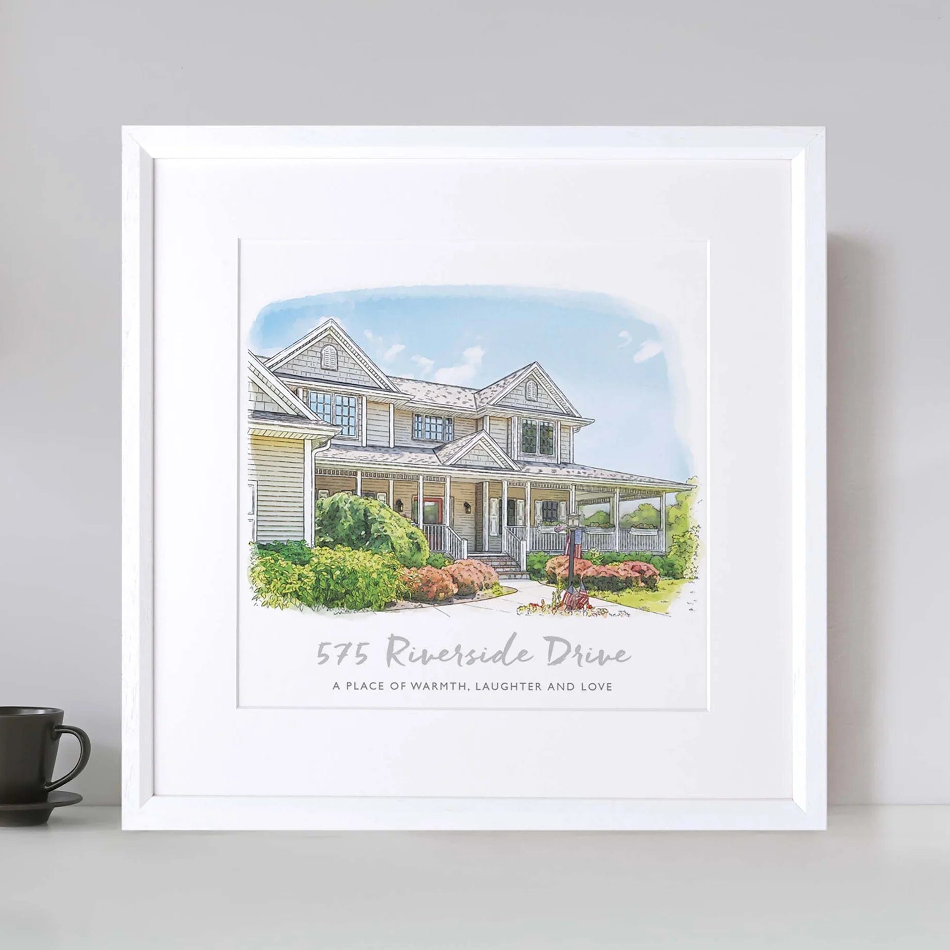 A personalized watercolor sketch of your house, hand-drawn by our team of wonderfully talented artists and printed with your choice of text. This makes the perfect housewarming gift, birthday surprise, or Christmas present.