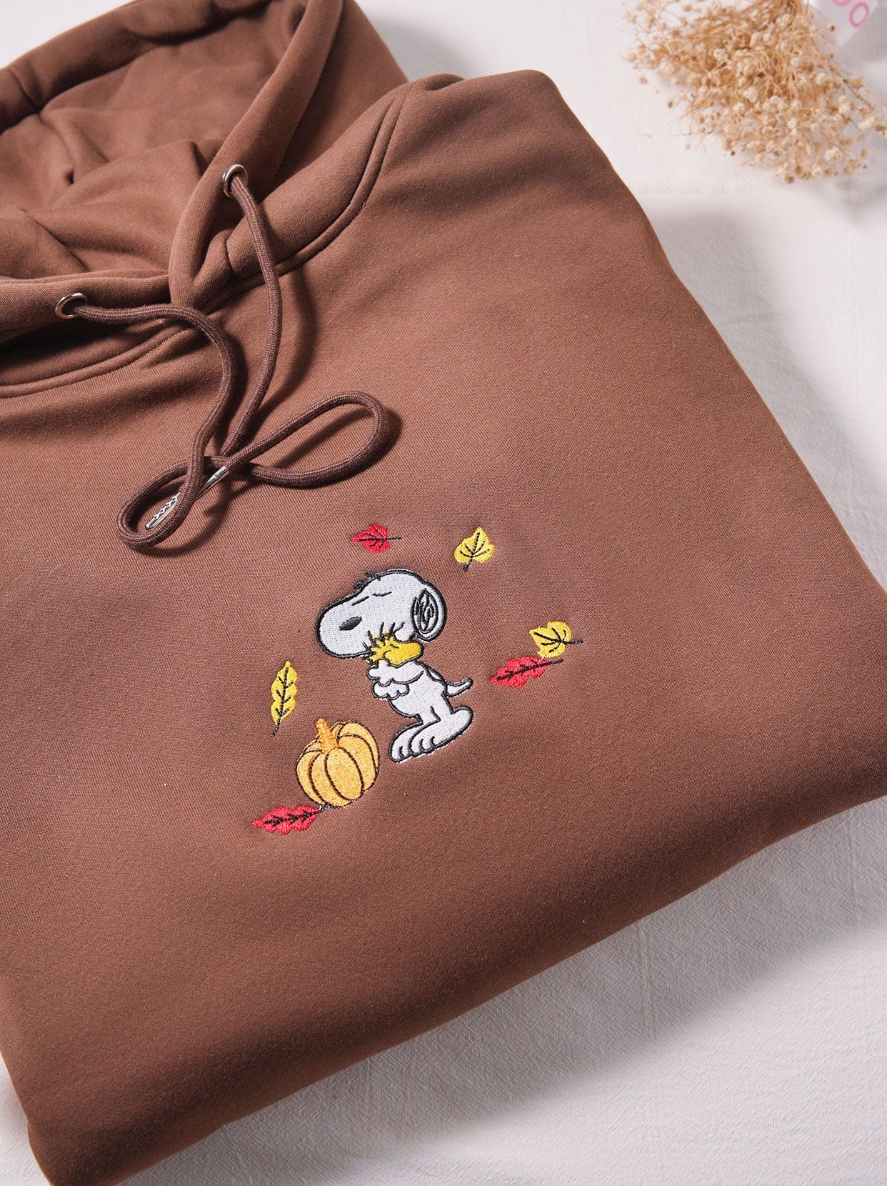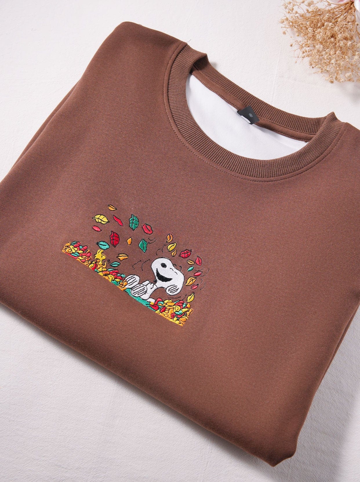 This cozy sweatshirt features a charming autumnal design that will warm both your heart and body. Crafted in a soft and comfortable brown hue, the hoodie boasts an eye-catching embroidery showcasing Snoopy, the beloved cartoon dog from Peanuts, dressed in a yellow scarf and surrounded by the symbols of the season – falling leaves and a festive orange pumpkin.