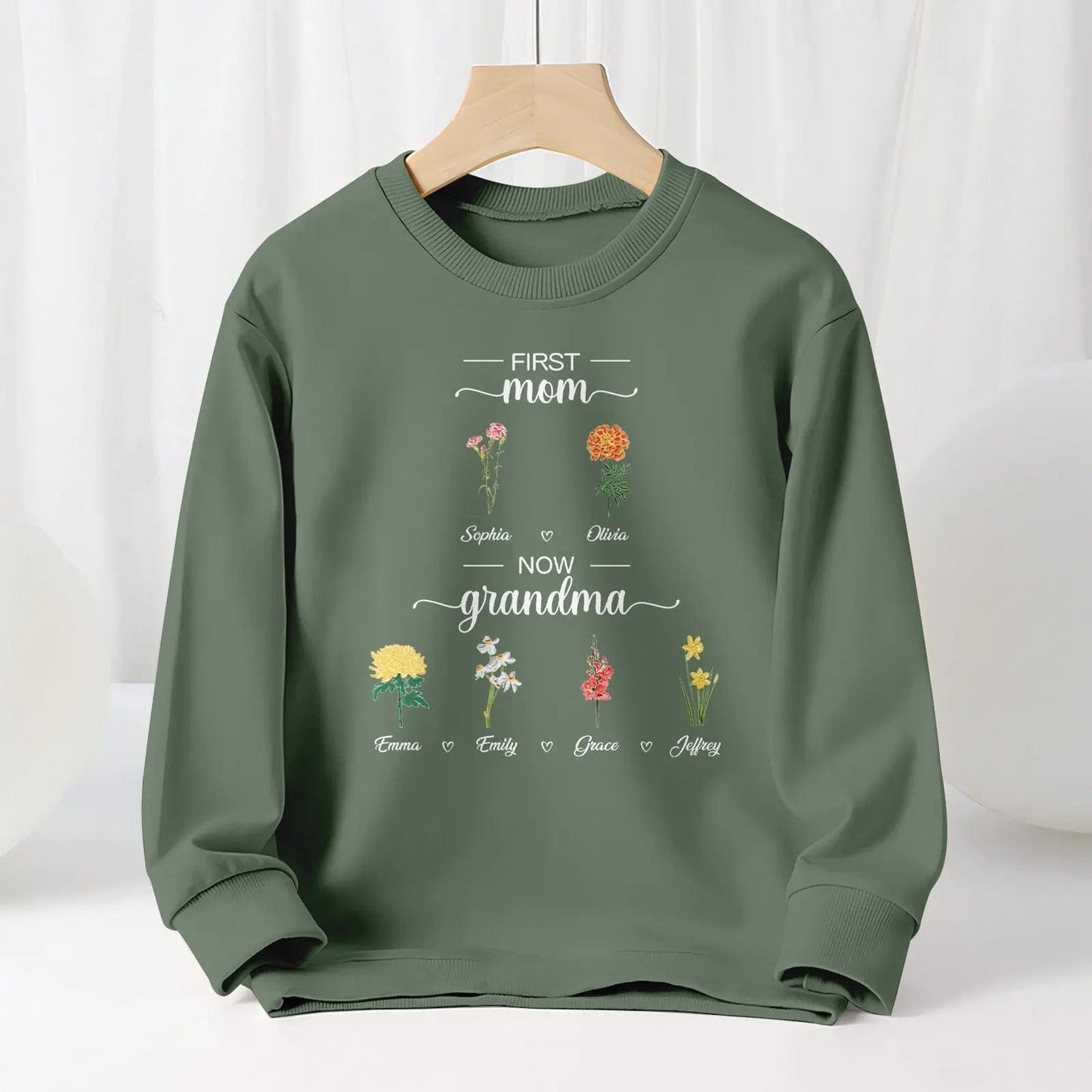 Personalized First Mom Now Grandma Sweatshirt Custom Birth Flowers Sweatshirts for Mother's Day Gift