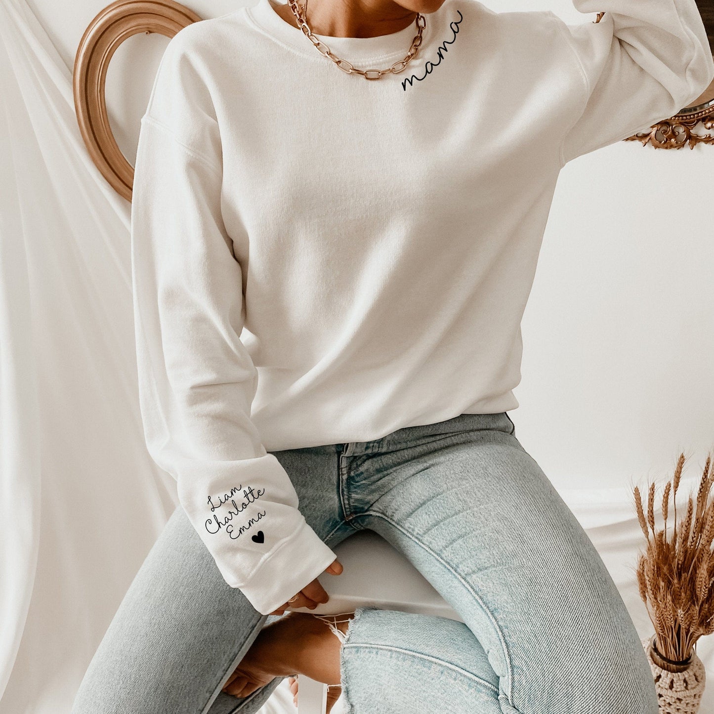 Spaccatura della mamma personalizzata con nome per bambini su manica, collo di design al collo e manica personalizzati, festa della mamma, regalo per la mamma