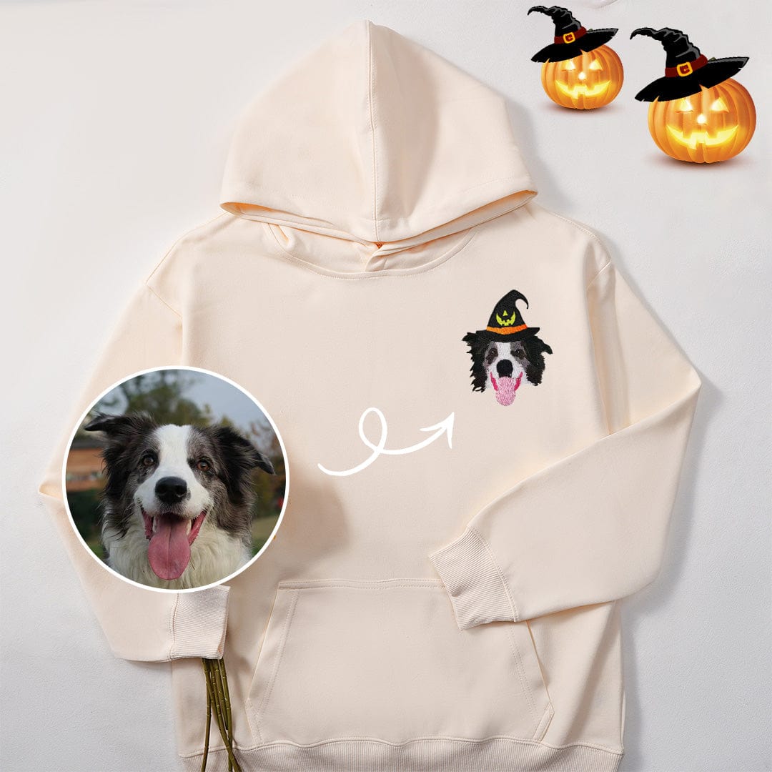 Celebrate Halloween in a personal way with our custom embroidered pet portrait paired with a Halloween witch hat sweatshirt or hoodie!